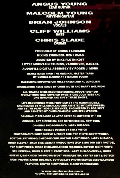 A1. Thunderstruck A2. Shoot To Thrill A3. Back In Black A4. Sin City A5. Who Made Who A6. Fire Your Guns B1. Jailbreak B2. The Jack B3. The Razors Edge B4. Dirty Deeds Done Dirt Cheap C1. Hells Bells C2. Heatseeker C3. That's The Way I Wanna Rock 'N' Roll C4. High Voltage C5. You Shook Me All Night Long D1. Whole Lotta Rosie D2. Let There Be Rock D3. Highway To Hell D4. T.N.T. D5. For Those About To Rock (We Salute You)