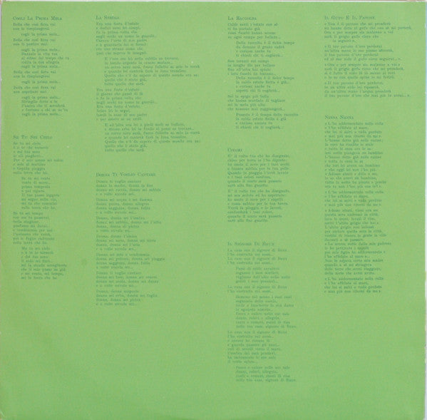 A1. Cogli La Prima Mela A2. Se Tu Sei Cielo A3. La Strega A4. Donna Ti Voglio Cantare A5. La Raccolta B1. Colori B2. Il Signore Di Baux B3. Il Gufo E Il Pavone B4. Ninna Nanna