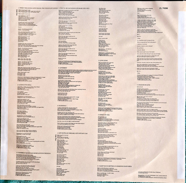 A1. When The Going Gets Tough, The Tough Get Going A2. Licence To Chill A3. Caribbean Queen (No More Love On The Run) A4. There'll Be Sad Songs (To Make You Cry) A5. Loverboy A6. Suddenly B1. Get Outta My Dreams, Get Into My Car B2. Love Zone B3. Here's To You B4. I Sleep Much Better (In Someone Else's Bed) B5. The Colour Of Love