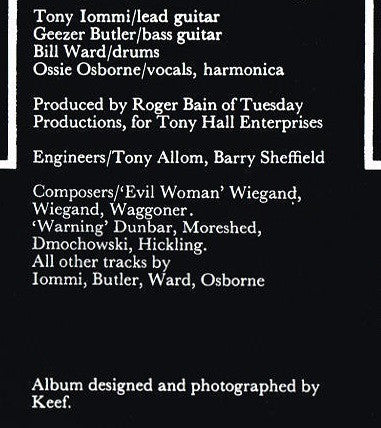 A1. Black Sabbath A2. The Wizard A3. Behind The Wall Of Sleep A4. N.I.B. B1. Evil Woman (Don't Play Your Games With Me) B2. Sleeping Village B3. Warning