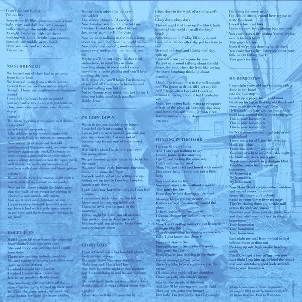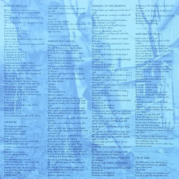 A1. Born In The U.S.A. A2. Cover Me A3. Darlington County A4. Working On The Highway A5. Downbound Train A6. I'm On Fire B1. No Surrender B2. Bobby Jean B3. I'm Goin' Down B4. Glory Days B5. Dancing In The Dark B6. My Hometown