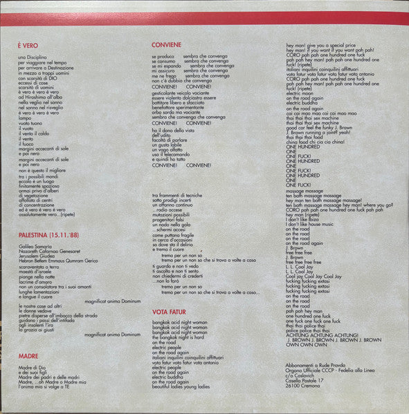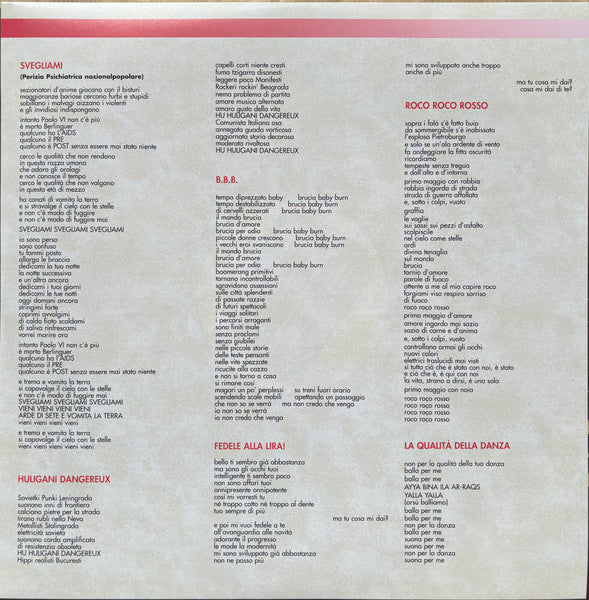 A1. Il Testamento Del Capitano A2. Svegliami A3. Huligani Dangereux A4. B.b.b. A5. Fedele Alla Lira? A6. Roco . Roco . Rosso A7. La Qualita' Della Danza B1. E' Vero B2. Palestina (15/11/1988) B3. Madre B4. Conviene B5. And The Radio Plays B6. Vota FATUR B7. Reclame