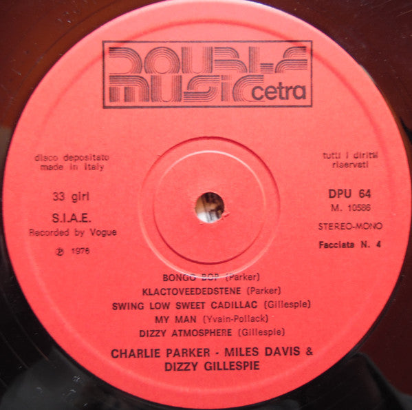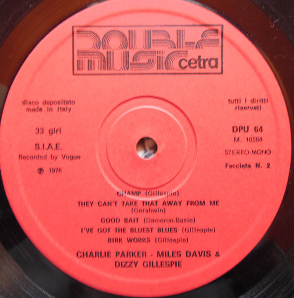 A1. A Night In Tunisia (Part. 1) A2. A Night In Tunisia (Part. 2) A3. Confirmation A4. Groovin' High (Part. 1) A5. Groovin' High (Part. 2) B1. The Champ B2. They Can't Take That Away From Me B3. Good Bait B4. I've Got The Bluest Blues B5. Birks Works C1. Bird Feathers C2. Air Conditioning C3. Quasimodo C4. Crazealogy C5. Dewey Square D1. Bongo Bop D2. Klaktoveededstene D3. Swing Low, Sweet Cadillac D4. My Man D5. Dizzy Atmosphere