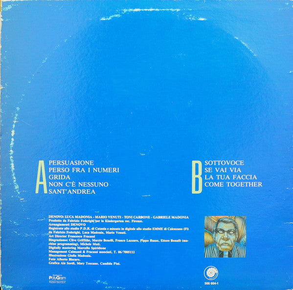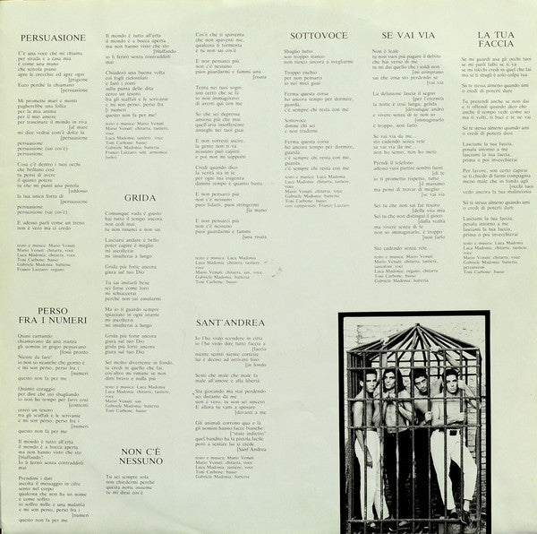 A1. Persuasione A2. Preso Tra I Numeri A3. Grida A4. Non C'e' Nessuno A5. Sant'Andrea B1. Sottovoce B2. Se Vai Via B3. La Tua Faccia B4. Come Together