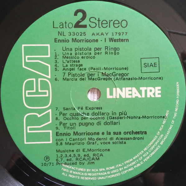 A1. Il Buono, Il Brutto, Il Cattivo A2. Lonesome Billy A3. Gli Indiani A4. Le Pistole Non Discutono A5. Il Ritorno Di Ringo A6. Titoli A7. Addio A Cheyenne A8. Come Una Sentenza B1. Una Pistola Per Ringo B2. Messico Eroico B3. L'Attesa B4. La Strage B5. Angel Face B6. Marcia Per MacGregor B7. Santa Fe' Express B8. Occhio Per Occhio B9. Titoli