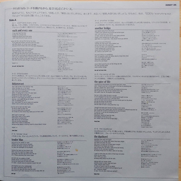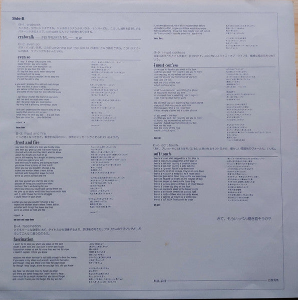 A1. Each And Every One A2. Bittersweet A3. Tender Blue A4. Another Bridge A5. The Spice Of Life A6. The Dustbowl B1. Crabwalk B2. Even So B3. Frost And Fire B4. Fascination B5. I Must Confess B6. Soft Touch