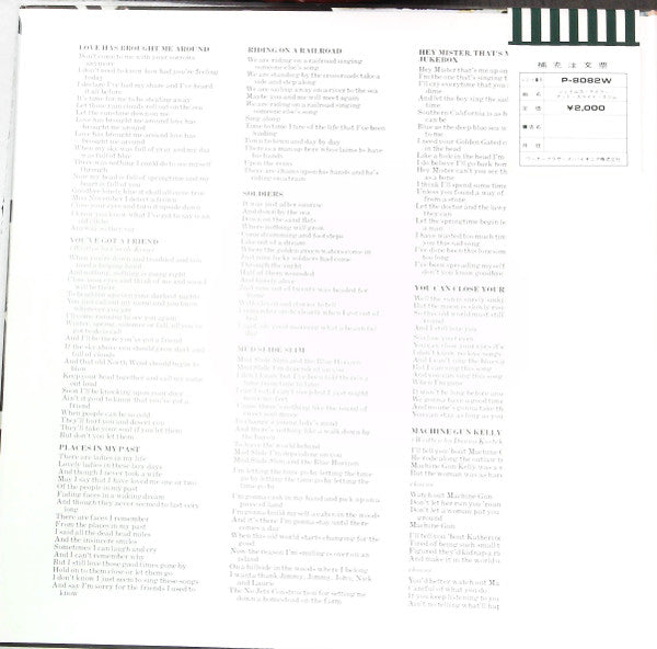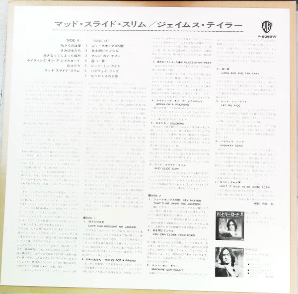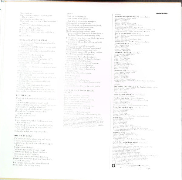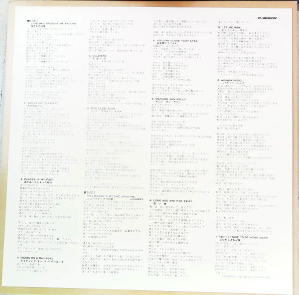 A1. Love Has Brought Me Around A2. You've Got A Friend A3. Places In My Past A4. Riding On A Railroad A5. Soldiers A6. Mud Slide Slim B1. Hey Mister, That's Me Up On The Jukebox B2. You Can Close Your Eyes B3. Machine Gun Kelly B4. Long Ago And Far Away B5. Let Me Ride B6. Highway Song B7. Isn't It Nice To Be Home Again