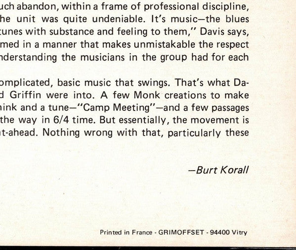 A1. Tickle Toe A2. Save Your Love For Me A3. Funky Fluke B1. Epistrophy B2. Well, You Needn't B3. I Mean You C1. Good Bait C2. Walkin' C3. Blues Up And Down D1. Camp Meeting D2. Blue Lou D3. How Am I To Know? D4. Tin Tin Deo