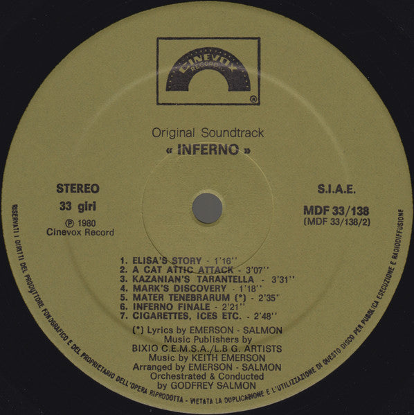 A1. Inferno (Main Title Theme) A2. Rose's Descent Into The Cellar A3. Taxi Ride (Rome) A4. The Library A5. Sarah In The Library Vaults A6. Bookbinder's Delight A7. Rose Leaves The Apartment A8. Rose Gets It B1. Elisa's Story B2. A Cat Attic Attack B3. Kazanian's Tarantella B4. Mark's Discovery B5. Mater Tenebrarum B6. Inferno Finale B7. Cigarettes, Ices, Etc.