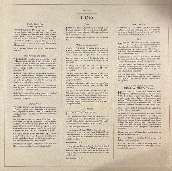 A1. It's Sin That's Got Its Hold Upon Us A2. Blue Marbled Elm Trees A3. Burial Bleak A4. Dust A5. Walter de La Nightmare B1. Susie Mullen B2. Love Is A Curse B3. Ides B4. Please Come Back, I Will Listen, I Will Behave, I Will Toe The Line B5. Drone In B#