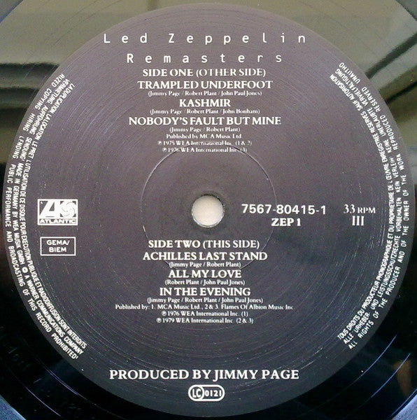 A1. Communication Breakdown A2. Babe I'm Gonna Leave You A3. Good Times Bad Times A4. Dazed And Confused A5. Heartbreaker B1. Whole Lotta Love B2. Ramble On B3. Since I've Been Loving You B4. Celebration Day B5. Immigrant Song C1. Black Dog C2. Rock And Roll C3. The Battle Of Evermore C4. Stairway To Heaven D1. The Song Remains The Same D2. D'yer Mak'er D3. No Quarter D4. Houses Of The Holy E1. Trampled Underfoot E2. Kashmir E3. Nobody's Fault But Mine F1. Achilles Last Stand F2. All My Love F3. In The Evening