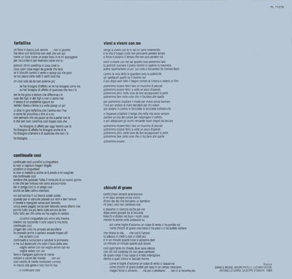 A1. Silvia Lo Sai A2. Caro Gesù A3. Lungomare A4. Voglia Di Vivere A5. Gli Autobus Di Notte B1. Farfallina B2. Continuate Così B3. Vieni A Vivere Con Me B4. Chicchi Di Grano