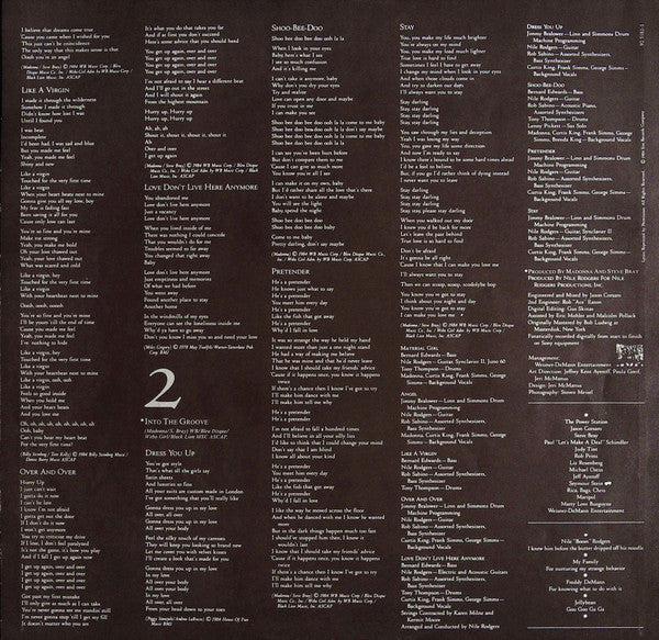 A1. Material Girl A2. Angel A3. Like A Virgin A4. Over And Over A5. Love Don't Live Here Anymore B1. Into The Groove B2. Dress You Up B3. Shoo-Bee-Doo B4. Pretender B5. Stay