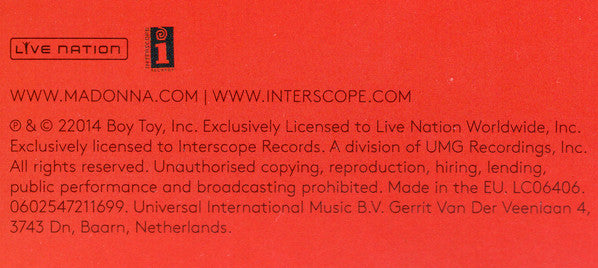 A1. Living For Love A2. Devil Pray A3. Ghosttown A4. Unapologetic Bitch A5. Illuminati B1. Bitch I'm Madonna B2. Hold Tight B3. Joan Of Arc B4. Iconic B5. HeartBreakCity C1. Body Shop C2. Holy Water C3. Inside Out C4. Wash All Over Me C5. Best Night D1. Veni Vidi Vici D2. S.E.X. D3. Messiah D4. Rebel Heart