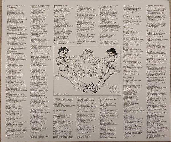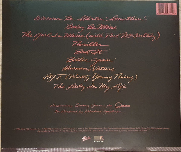 A1. Wanna Be Startin' Somethin' A2. Baby Be Mine A3. The Girl Is Mine A4. Thriller B1. Beat It B2. Billie Jean B3. Human Nature B4. P.Y.T. (Pretty Young Thing) B5. The Lady In My Life
