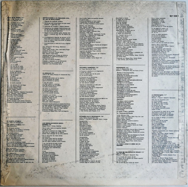 A1. Rock En El Ruedo A2. La Huerta Atomica - Una Siesta Atomica / Instrucciones A La Población Civil A3. Al-Andalus A4. Los Viejos Rockeros Nunca Mueren B1. Rockanrol Bumerang B2. Extraños En El Escaparate B3. Rock & Rios - Bienvenidos B4. Rock De Una Noche De Verano B5. La Encrucijada