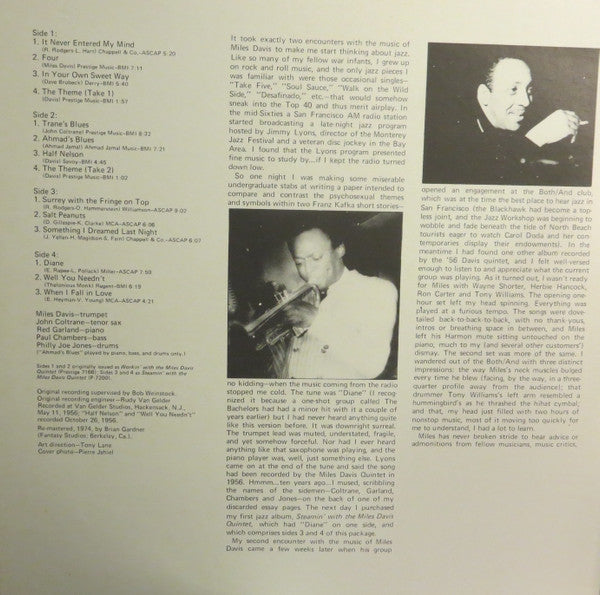 A1. It Never Entered My Mind A2. Four A3. In Your Own Sweet Way A4. The Theme (Take 1) B1. Trane's Blues B2. Ahmad's Blues B3. Half Nelson B4. The Theme (Take 2) C1. The Surrey With The Fringe On Top C2. Salt Peanuts C3. Something I Dreamed Last Night D1. Diane D2. Well You Needn't D3. When I Fall In Love