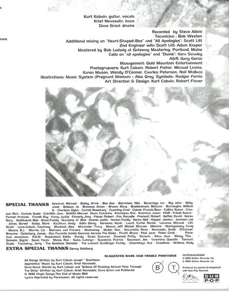 A1. Serve The Servants A2. Scentless Apprentice A3. Heart-Shaped Box A4. Rape Me A5. Frances Farmer Will Have Her Revenge On Seattle A6. Dumb B1. Very Ape B2. Milk It B3. Pennyroyal Tea B4. Radio Friendly Unit Shifter B5. Tourette's B6. All Apologies