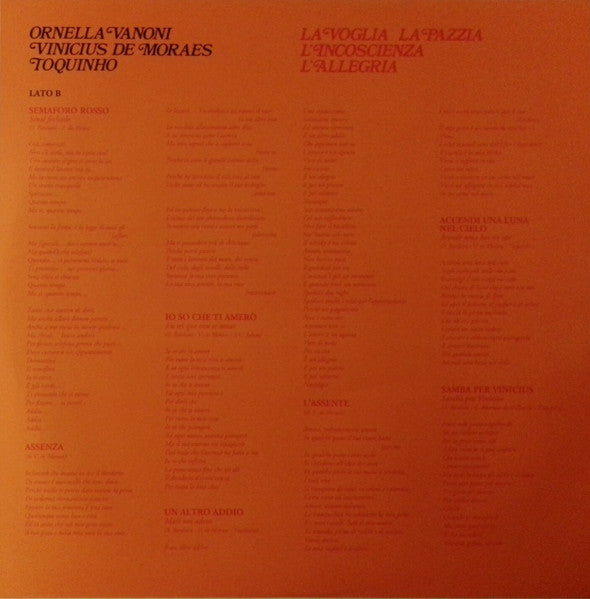 A1. Senza Paura (Sem Mêdo) A2. La Rosa Spogliata (A Rosa Desfolhada) A3. Samba Della Rosa (Samba Da Rosa) A4. Samba In Preludio (Samba Em Preludio) A5. Anema E Core A6. La Voglia La Pazzia (Se Ela Quisesse) B1. Semaforo Rosso (Sinal Fechado) B2. Assenza B3. Io So Che Ti Amerò (Eu Sei Que Vou Te Amar) B4. Un Altro Addio (Mais Um Adeus) B5. L'assente B6. Accendi Una Luna Nel Cielo (Acende Uma Lua No Ceu) B7. Samba Per Vinicius (Samba Pra Vinicius)