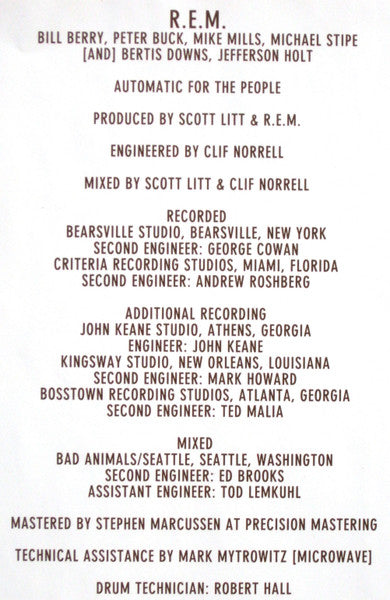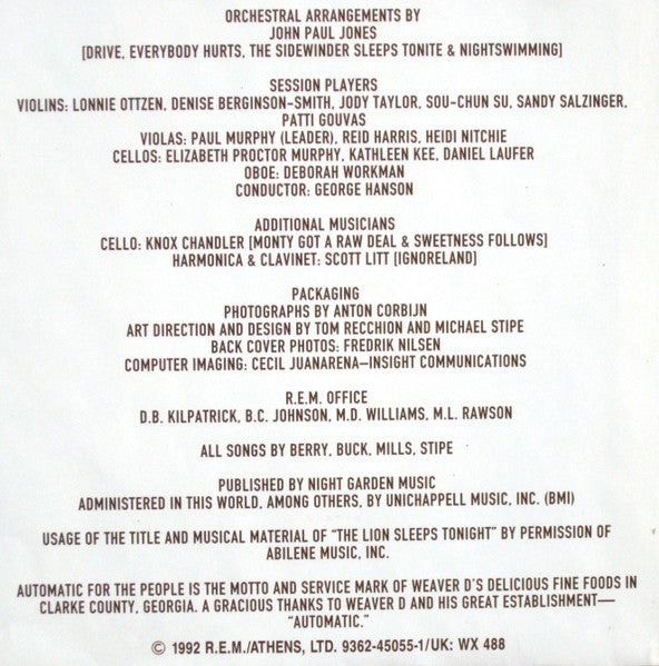 A1. Drive A2. Try Not To Breathe A3. The Sidewinder Sleeps Tonite A4. Everybody Hurts A5. New Orleans Instrumental No. 1 A6. Sweetness Follows B1. Monty Got A Raw Deal B2. Ignoreland B3. Star Me Kitten B4. Man On The Moon B5. Nightswimming B6. Find The River