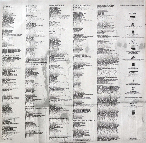 A1. Testify A2. Guerrilla Radio A3. Calm Like A Bomb A4. Mic Check A5. Sleep Now In The Fire A6. Born Of A Broken Man B1. Born As Ghosts B2. Maria B3. Voice Of The Voiceless B4. New Millennium Homes B5. Ashes In The Fall B6. War Within A Breath