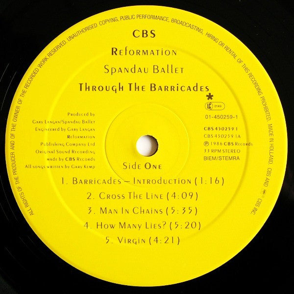 A1. Barricades - Introduction A2. Cross The Line A3. Man In Chains A4. How Many Lies? A5. Virgin B1. Fight For Ourselves B2. Swept B3. Snakes And Lovers B4. Through The Barricades