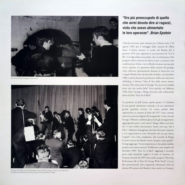 A1. Free As A Bird A2. "We Were Four Guys... That's All" A3. That'll Be The Day A4. In Spite Of All The Danger A5. "Sometimes I'd Borrow... Those Still Exist" A6. Hallelujah, I Love Her So A7. You'll Be Mine A8. Cayenne A9. "First Of All... I Didn't Do A Thing Here" A10. My Bonnie A11. Ain't She Sweet A12. Cry For A Shadow B1. "Brian Was A Beautiful Guy... He Presented Us Well" B2. "I Secured Them... A Beatle Drink Even Then" B3. Searchin' B4. Three Cool Cats B5. The Sheik Of Araby B6. Like Dreamers Do B7. Hello Little Girl B8. "Well, The Recording Test... By My Artists" B9. Besame Mucho B10. Love Me Do B11. How Do You Do It B12. Please Please Me C1. One After 909 (Sequence) C2. One After 909 (Complete) C3. Lend Me Your Comb C4. I'll Get You C5. "We Were Performers... In Britain" C6. I Saw Her Standing There C7. From Me To You C8. Money (That's All What I Want) C9. You Really Got A Hold On Me C10. Roll Over Beethoven D1. She Loves You D2. Till There Was You D3. Twist And Shout D4. This Boy D5. I Want To Hold Your Hand D6. "Boys, What I Was Thinking..." D7. Moonlight Bay D8. Can't Buy Me Love E1. All My Loving E2. You Can't Do That E3. And I Love Her E4. A Hard Day's Night E5. I Wanna Be Your Man E6. Long Tall Sally E7. Boys E8. Shout E9. I'll Be Back (Take 2) E10. I'll Be Back (Take 3) F1. You Know What To Do F2. No Reply (Demo) F3. Mr. Moonlight F4. Leave My Kitten Alone F5. No Reply F6. Eight Days A Week (Sequence) F7. Eight Days A Week (Complete) F8. Kansas City / Hey-Hey-Hey-Hey!