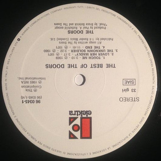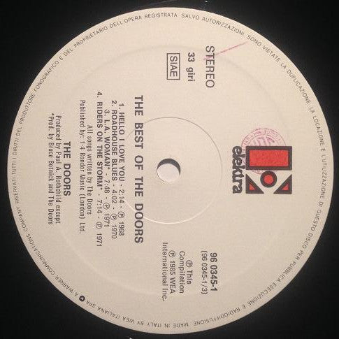 A1. Break On Through (To The Other Side) A2. Light My Fire A3. The Crystal Ship A4. People Are Strange A5. Strange Days A6. Love Me Two Times B1. Five To One B2. Waiting For The Sun B3. Spanish Caravan B4. When The Music's Over C1. Hello, I Love You C2. Roadhouse Blues C3. L. A. Woman C4. Riders On The Storm D1. Touch Me D2. Love Her Madly D3. The Unknown Soldier D4. The End