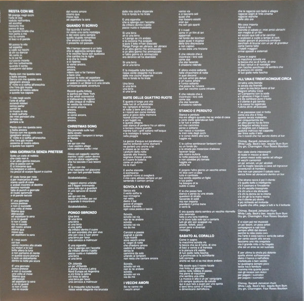 A1. Resta Con Me A2. Una Giornata Senza Pretese A3. Quando Ti Scrivo A4. Christmas Song A5. Pongo Sbronzo A6. Suite Delle Quattro Ruote B1. Scivola Vai Via B2. I Vecchi Amori B3. Stanco E Perduto B4. Sabato Al Corallo B5. All’Una E Trentacinque Circa