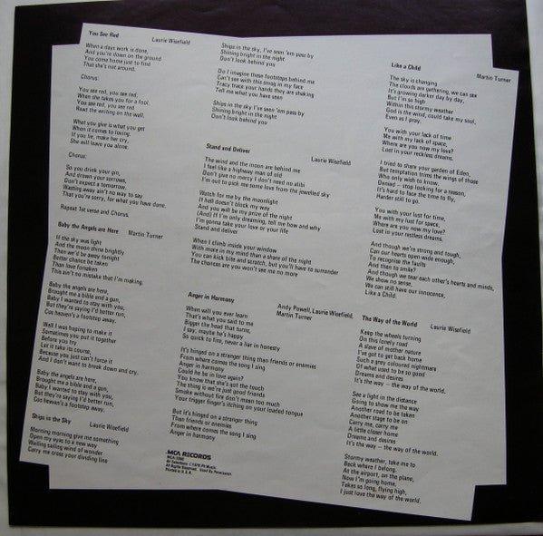 A1. You See Red A2. Baby The Angels Are Here A3. Ships In The Sky A4. Stand And Deliver B1. Anger In Harmony B2. Like A Child B3.a. The Way Of The World (Part 1) B3.b. The Way Of The World (Part 2)